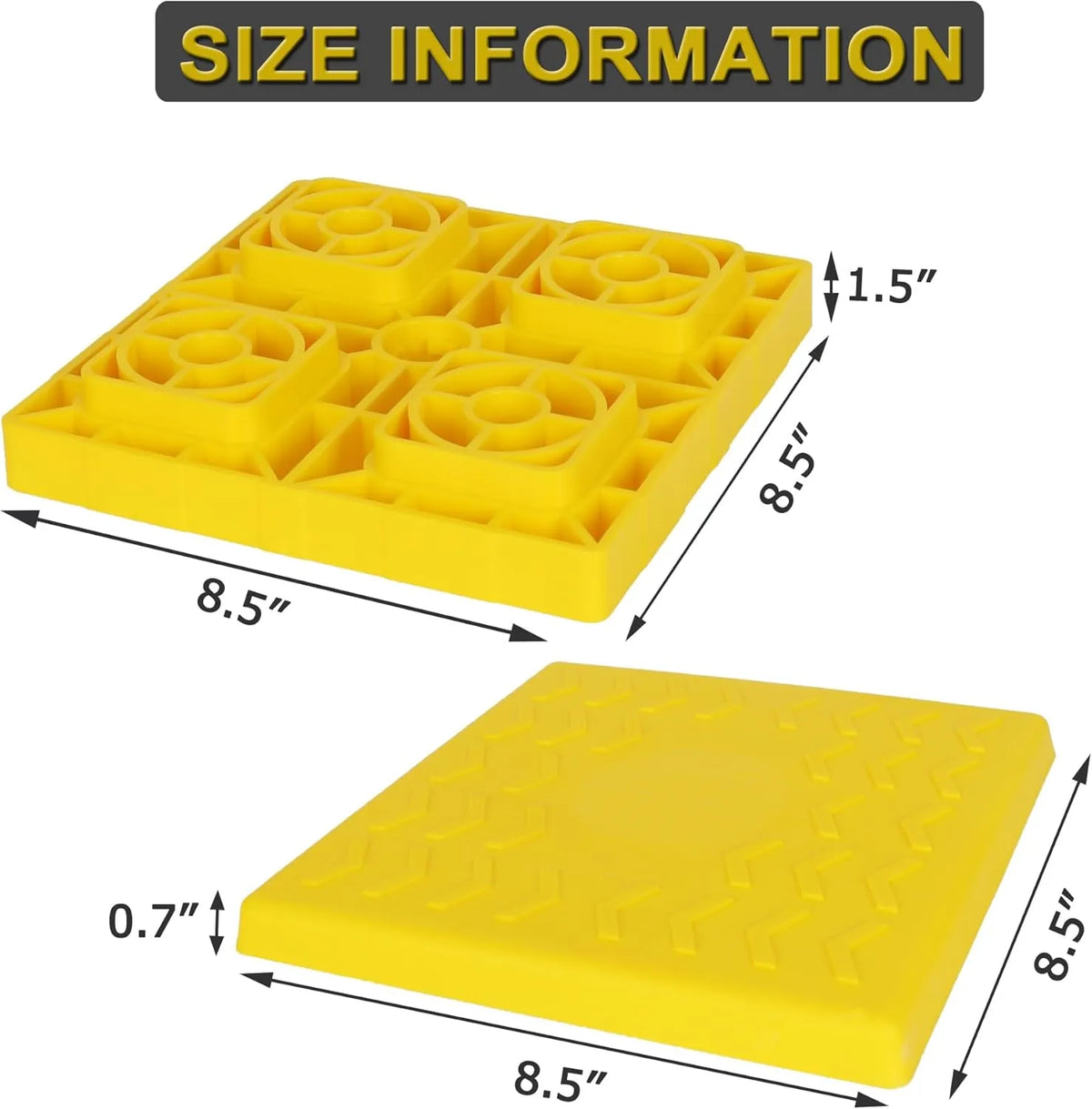 Support most shapes of jacks and stabilizers and works with any foot or post, round or square, such as scissor jacks, pad jacks, etc.