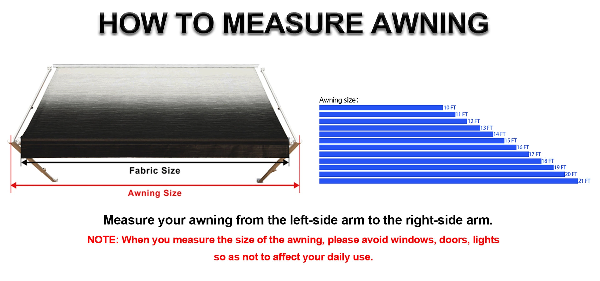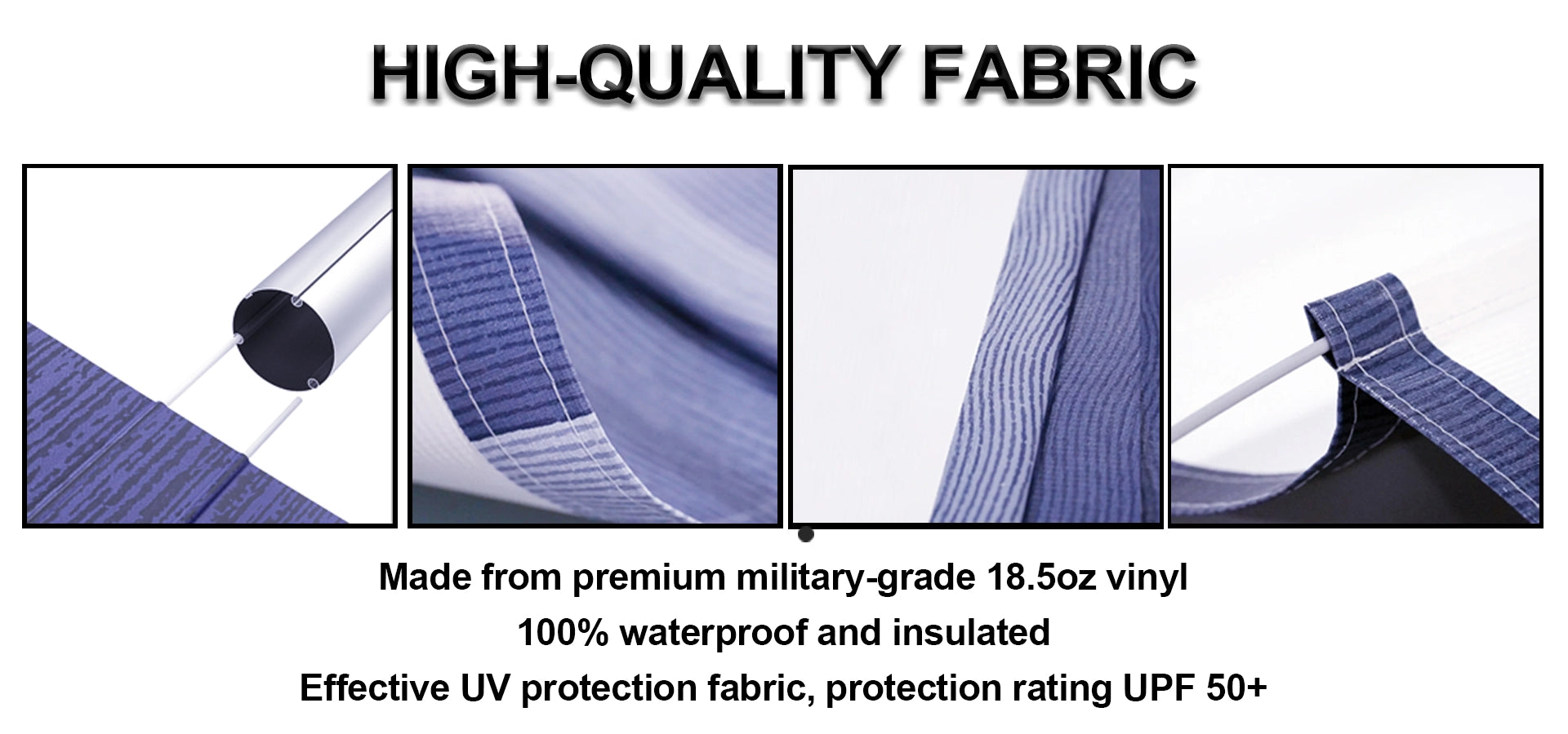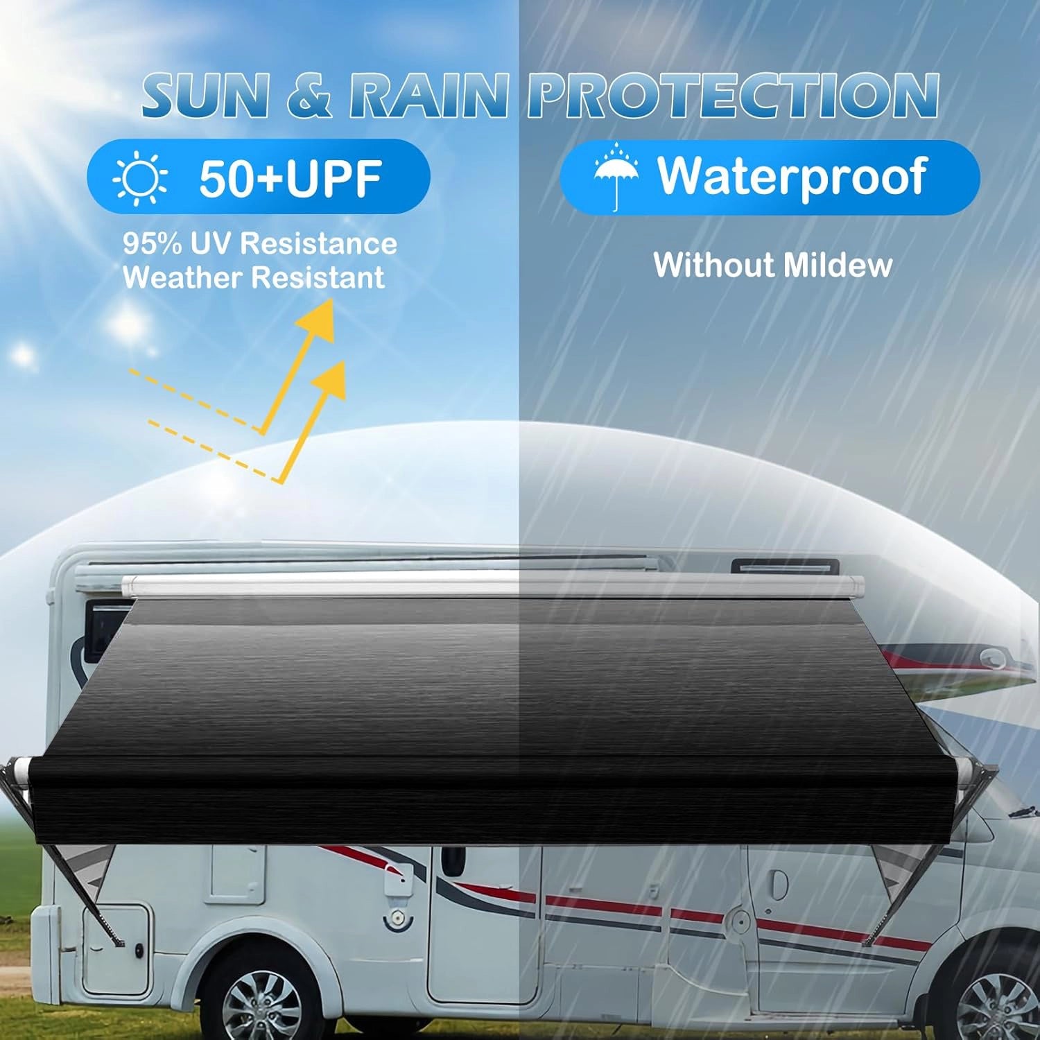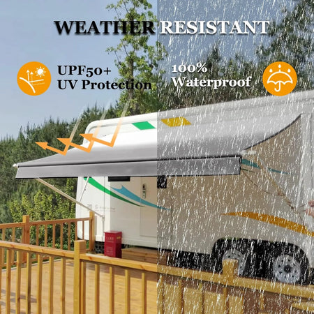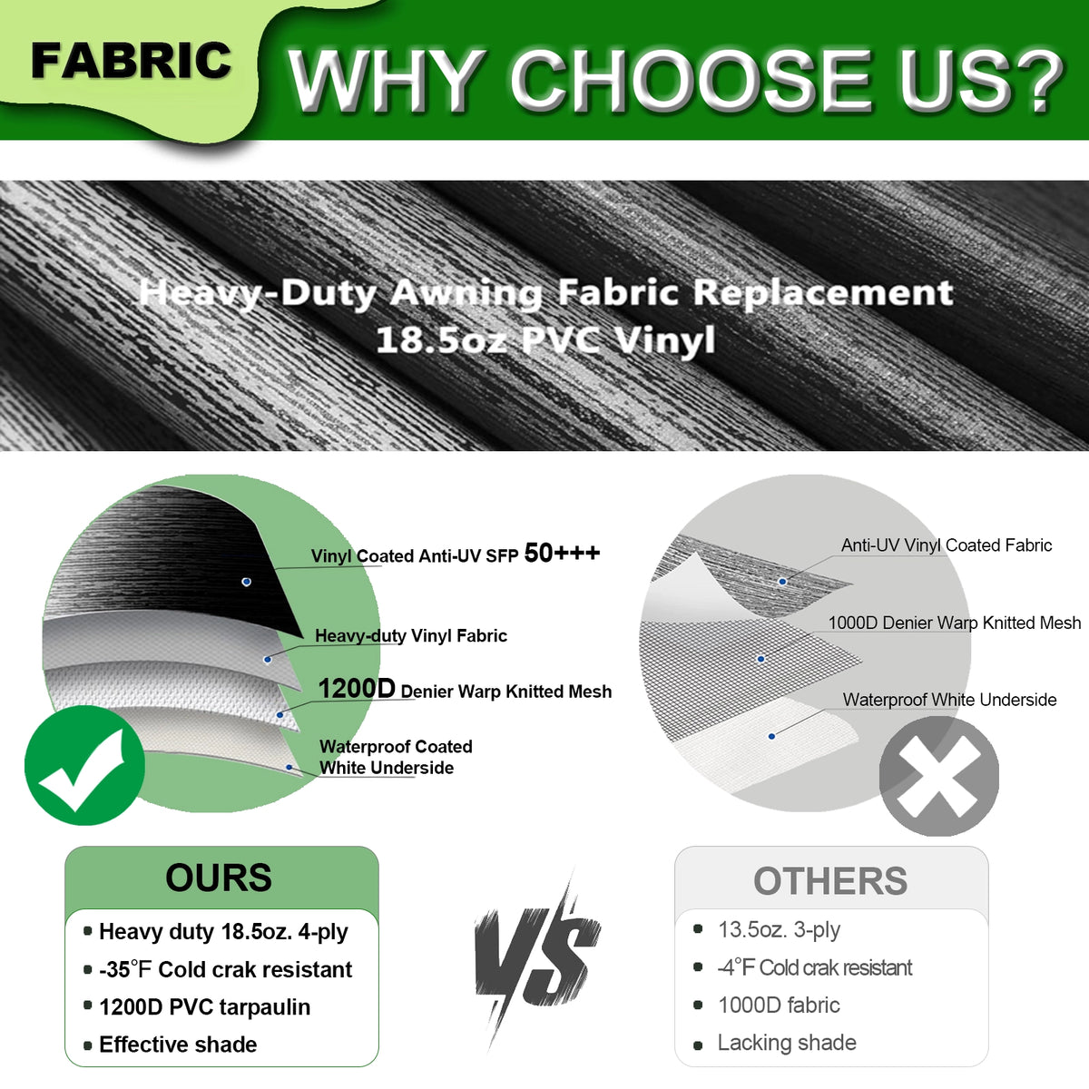 The RV awning fabric is made of high-quality 18.5 oz (approximately 577 grams) vinyl, which is durable, waterproof, UV-resistant, sun-resistant, and has excellent light-blocking properties.