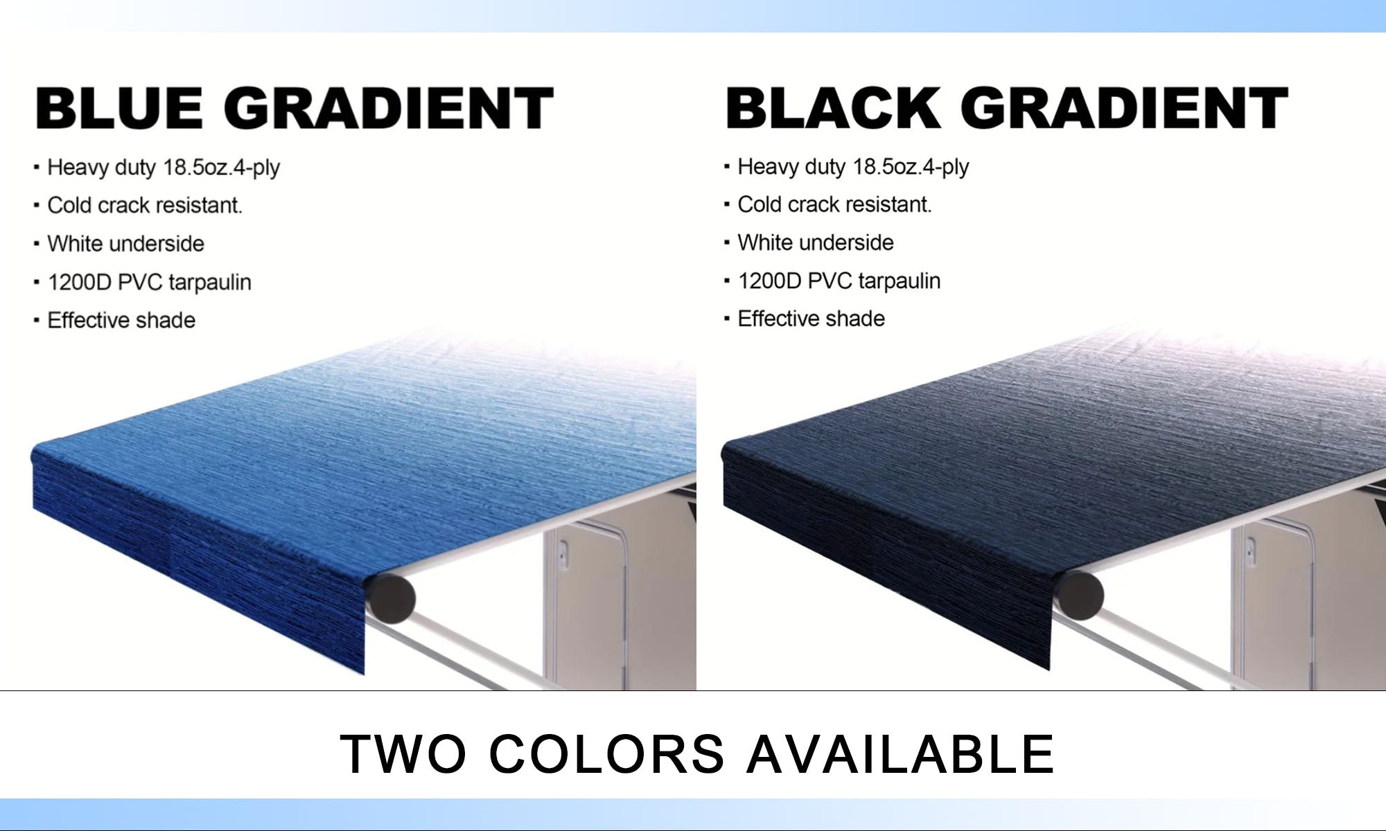 Our RV awning fabric is made of 18.5oz four-layer PVC vinyl, which outperforms standard fabrics and offers superior tear and cold crack resistance.